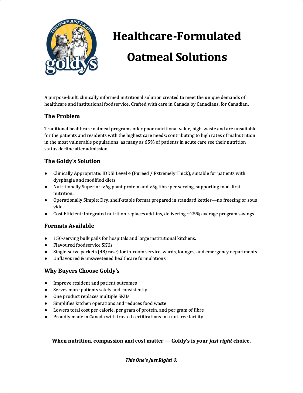 At Goldy’s, our commitment to Canadian healthcare is deeply rooted in who we are as a family-centric brand. We believe food should nourish, not complicate—especially for those who rely on the healthcare system during vulnerable moments of life. As a Canadian company, we care deeply about supporting outcomes that matter: simple ingredients, gentle nutrition, and foods that are easy to prepare, easy to digest, and comforting to eat. Our products are thoughtfully formulated to be better-for-you without sacrificing taste or familiarity, making them suitable for patients, residents, and families alike. By partnering with Canadian healthcare providers, Goldy’s aims to contribute positively to daily nutrition, recovery, and quality of life—one warm, trusted bowl at a time.
